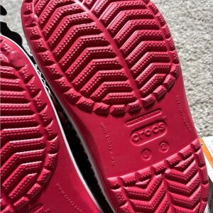 Experience the comfort and style of CROCS with these vibrant red and black sandals. Featuring a classic design with ventilation holes, these sandals are perfect for keeping your feet cool and comfortable. The lightweight foam construction ensures all-day wearability, while the adjustable heel strap offers a secure fit. Ideal for casual outings, these sandals combine functionality with a bold color palette. New with tags