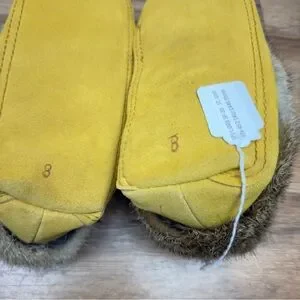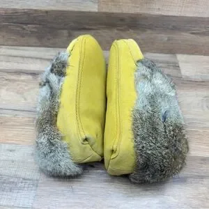 Cozy moccasins with fur trim and beaded details. Vibrant yellow color.