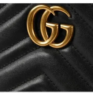 The mini GG Marmont chain shoulder bag has a softly structured shape and a zip top closure with Double G hardware. The chain shoulder strap has a leather shoulder detail. The camera bag is made in matelassé leather with a chevron design and GG on the back.