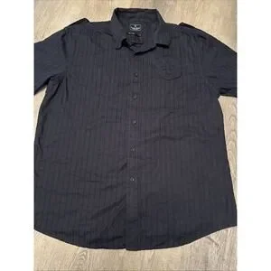 The Mark Echo New York size XL cotton button-down black shirt with cross wings design is a stylish and versatile addition to any man's wardrobe. Made from comfortable cotton material, this short sleeve shirt features a classic collared neckline and button closure. The spread collar and wing pattern give it a unique and fashionable edge, perfect for any season. Whether you're looking to add a touch of 90s flair to your outfit or simply want to make a statement, this button-up shirt from Marc Ecko is sure to impress.