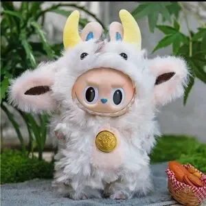 This adorable cow features a cute design with yellow horns and a fluffy white body.