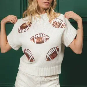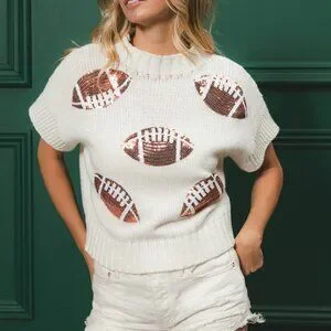 White knit sweater with sequin football design across the front. Made from soft, breathable fabric with short sleeves and a relaxed fit. Perfect for game day outfits, tailgate looks, or casual fall fashion. Easy to pair with denim shorts or jeans for a sporty, fun vibe. Great for football season, team spirit wear, and weekend style.