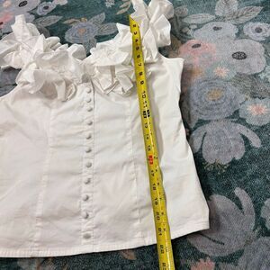 White sleeveless blouse with layered ruffle neckline and shoulders, deep V-cut, button-front closure, and side zip—crafted from 100% cotton with a fitted silhouette, lace-up corset detail, and romantic, vintage-inspired construction.