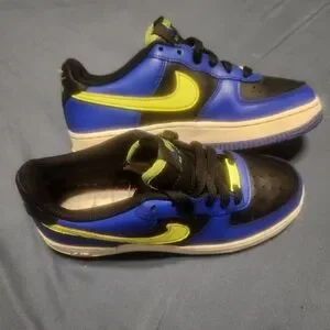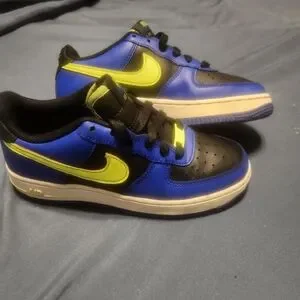 Vibrant Nike sneakers for kids. Blue and black with neon yellow accents. Durable and stylish for everyday wear.