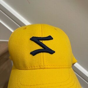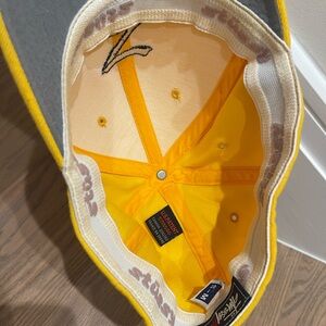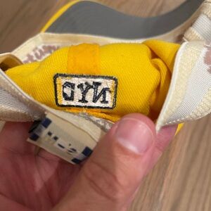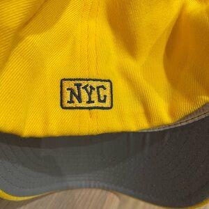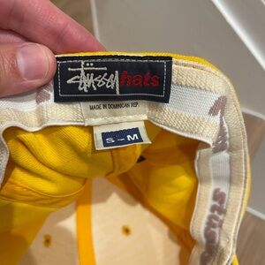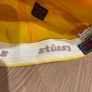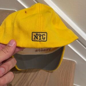 Color is yellow gold with a navy blue Stussy “S” across the front and “NYC” on the back.