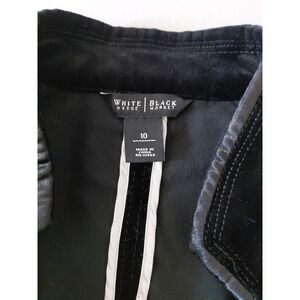 The WHBM Velvet Blazer Jacket in size 10 is a stylish and versatile piece suitable for various occasions. Made with velvet outer shell material and a cotton blend lining, this military-inspired jacket features a button closure and long sleeves. Perfect for the fall, winter, and spring seasons, the black color and solid pattern make it easy to accessorize and pair with different outfits. With a midweight design and a regular fit, this blazer offers a touch of luxury while incorporating elements of gothic, retro punk, and indie styles.