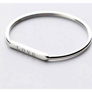 This is a new, white gold-plated S925 ring with the word "LOVE" engraved on a rectangular bar. The ring is made of 92.5% sterling silver and has a white gold plating. The ring is 0.1cm thick and the bar is 0.15cm high. The ring is in new condition with tags and comes in a box. It is a simple and elegant piece of jewelry that would make a great gift for a loved one.