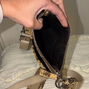 Elegant Coach crossbody with signature pattern. Features brown and tan hues. Ideal for versatile styling.