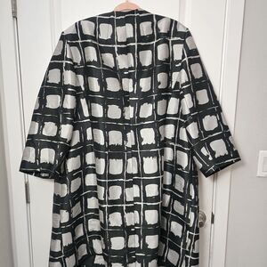 Stylish black and silver coat with a unique square pattern. Perfect for adding a bold touch to any outfit.