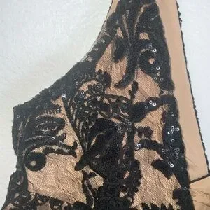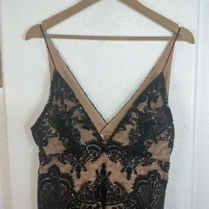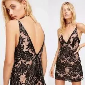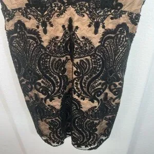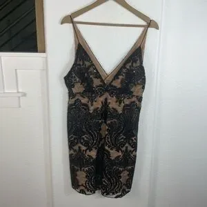 Chic mini dress with intricate black lace overlay. Features a deep V-neck and sleeveless design. Perfect for a night out.