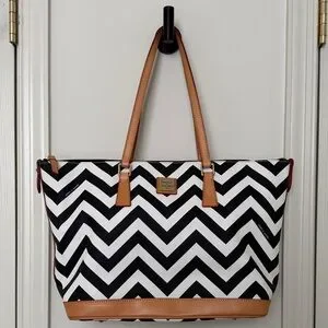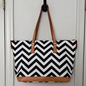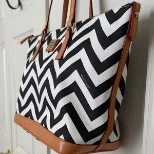 Dooney & Bourke Chevron Tote - Black and White with Tan Leather Trim