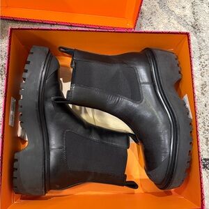 Sleek black leather boots. Features Tory Burch logo. Durable and stylish. With box and dust bag. Worn like 2-3 times