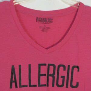 Peanuts sleep top shirt in Juniors size XL. Could be used as a shirt, short sleeves and a v neckline. Woodstock and Snoopy "Allergic to Mornings" on front of shirt. Made from 60% cotton and 40% poly, machine wash.