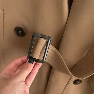 Stylish brown trench coat with double-breasted design. Features a classic belt and button details.