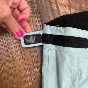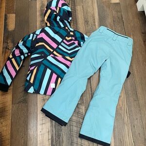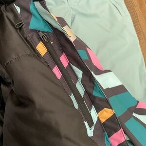 Reima relax, snowboard or snow ski coat and pants set. European size 146 or US 12–14. Waterproof. Taped seams. Air vents under arms with zippered closure. Zippered front pocket. Red gator with thumb slot. Adjustable arm cuffs. Waterproof. Hidden interior pockets. Goggle pouch. Cinch bottom. Earbud slot. Hidden arm pocket. Mint pants have the ability to zip to the back of inside jacket. Pants are lined and insulated also waterproof. Zippered hip pocket. Adjustable waist with exterior Velcro belt straps. Reinforced knee. Snow gator. Colors include black, mint, sage green, yellow, and pink. Set has been worn once in excellent condition.