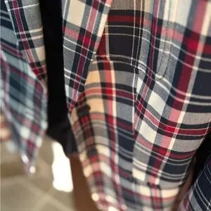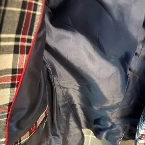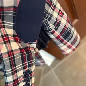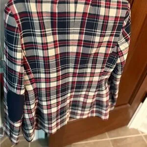 Chic checkered blazer by Tommy Hilfiger. Features red, navy, and tan pattern with elbow patches. Ideal for versatile styling. So cute and trendy! This item is used but in great condition! Comes from a smoke free home.