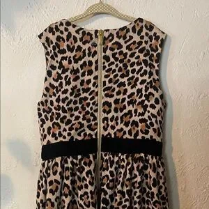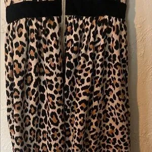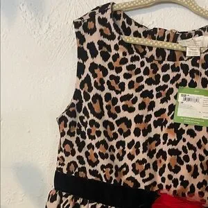Chic leopard print dress with a striking red flower detail. Ideal for casual outings.