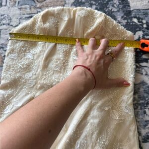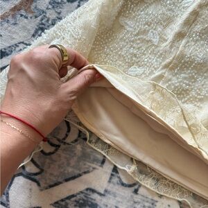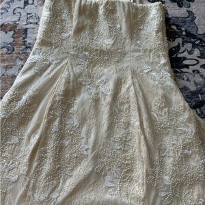 Elegant strapless mini dress. Features delicate lace detailing. Asymmetrical hem for a chic look.