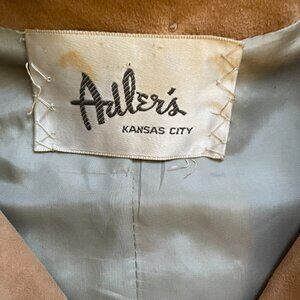 Absolutely beautiful! That's the only way to describe this incredible -- and incredibly soft -- camel-colored suede coat from the 1960's. Made by Highlander and sold at the iconic (and now defunct) Adler's department store in Kansas City, Missouri. Original Adler's tag included in an envelope with two spare buttons. Fully lined, this beautiful suede jacket features side slits and is a car coat length. Slim fit; three-quarter sleeves. Three large suede-covered buttons down the front and two generous front pockets. The collar, a sort of chic Peter Pan style, is also removable. When unbuttoned the coat has a simple collarless round neck. There is one mild area of discoloration on the right pocket (see photos for details), and a small mark on the back of one sleeve, but these hardly detract from the incredible beauty of this 1960's piece. The previous owner's initials are stitched inside the coat -- this was typical of the time; in order to differentiate coats checked (at a restaurant, say, or at the theater) women would often add a monogram on the inside lining. An awesome piece of history in great vintage condition! Flat sizing suggests this would best fit a small or small-medium. (The Adler’s tag reads size 6.) See photos for details and for flat sizing.