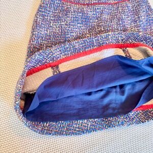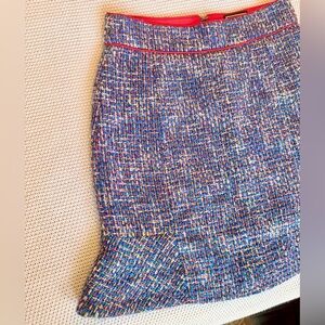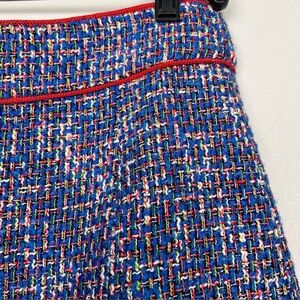 Stylish blue tweed skirt with red accents. Fluted A-line design for a flattering fit. Fully lined, zipper in back. Ideal for versatile wear.