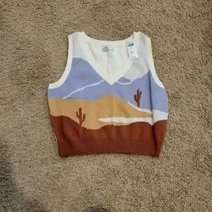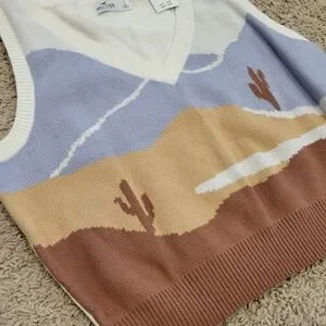 Stylish V-neck sweater vest. Features a desert landscape design. Perfect for layering.