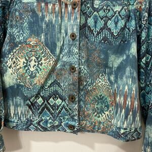 Coldwater Creek Women Medium Petite Blue Abstract Button Down Jacket Art to Wear