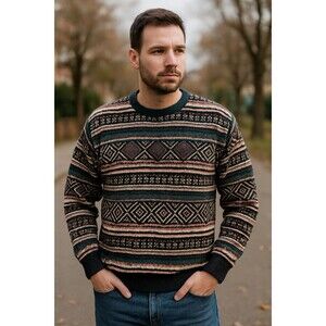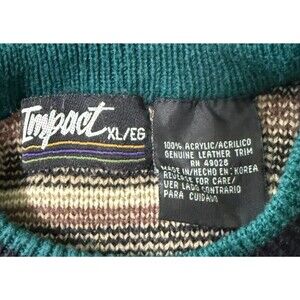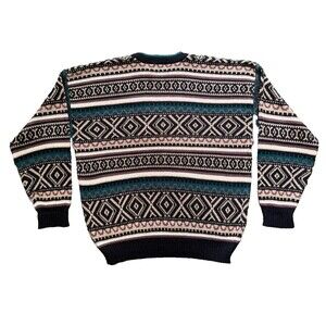 Vintage Impact Mens 80s Retro Tribal Aztec Knit Leather Applique Sweater XL
