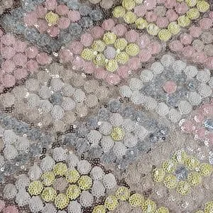 Eye-catching A-line skirt with sequin embellishments. Features a geometric pattern in pink, yellow, and gray. Perfect for a stylish look.