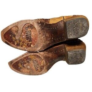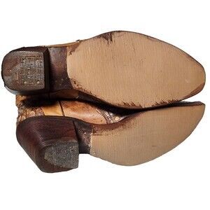 The Corral Python Women's Vintage Cowboy Boots in Size 9 are a stylish and comfortable choice for any casual or travel outfit. Featuring a pointed toe, mid-calf shaft, and embroidered accents, these boots are made of leather with a cushioned and comfortable insole. The brown color, animal print pattern, and Southwestern cowgirl theme add a touch of vintage flair to your look. With a mid heel and block heel style, these boots are perfect for year-round wear and are sure to become a versatile staple in your wardrobe. Old sole shown, as well as new sole.