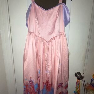 Charming midi dress with a castle print by Her Universe and the Disney shop. Features pink and purple hues. Perfect for a whimsical look.