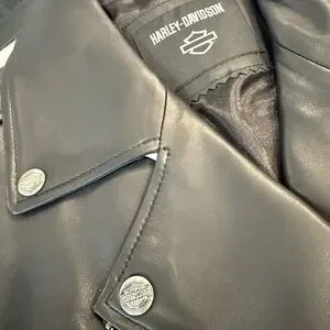 Sleek black leather vest with classic biker style. Features zippered pockets and iconic branding. Perfect for motorcycle enthusiasts.