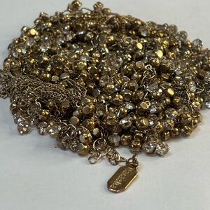 Long gold-tone and rhinestone tassel necklace. Hang tag stamped Natasha. Lobster claw clasp. Very good previously owned condition.