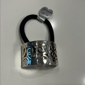Stylish hair tie with elegant silver swirls. Perfect for a chic look.