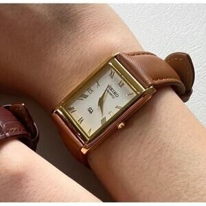 Vintage Style Seiko Quartz Mens Gold Watch & White accents W/ Leather Strap
