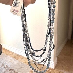 This stunning layered necklace features elegant blue beads and sleek silver chains, perfect for adding a touch of sophistication to any outfit.