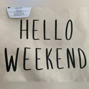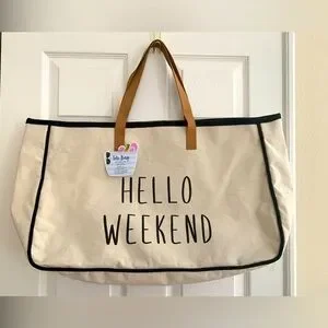 NWT JMLE LLC Large Tote: Oatmeal Color 💯% Cotton Canvas, Black “Hello Weekend” Print, Snap Close, 2 Brown Handles, 1 Inside Pocket. Measurements: 23x14x5 inches