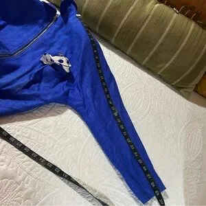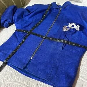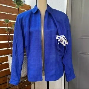CiaoSport Ltd Vintage Silk Blue Jacket Polka Dot Pocket Handkerchief Accent Sz 8. Front zipper opening. Dolman/batwing sleeves are padded at shoulders. Fully lined, 100% silk. In good pre-owned condition. A few small holes in the lining as shown on pic #8. Please see approximate flat lay measurements shown on photos.