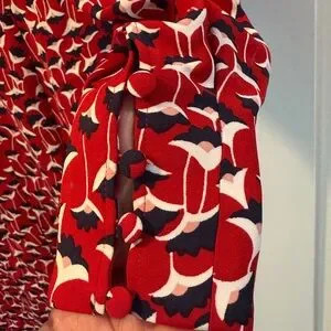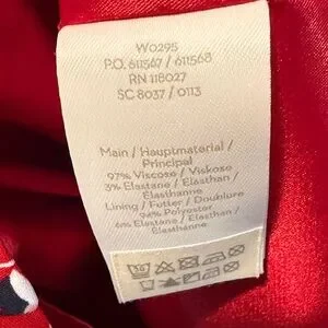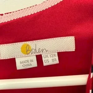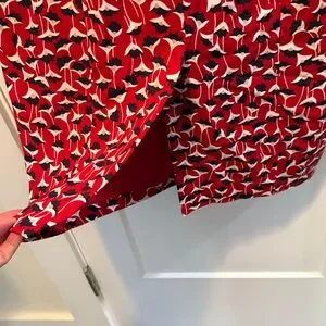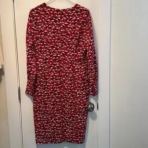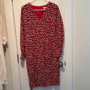 Boden Hannah sheath dress in Poinsettia. Hidden back zipper. V-neck. Long sleeves with fabric covered buttons at wrist shown in picture above. Lined. US Size 8R. Excellent preowned condition.