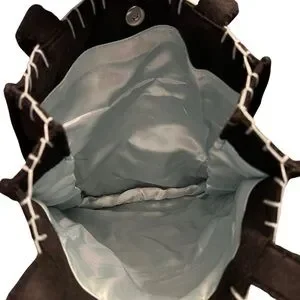The larger bag has a white ghost embroidered appliqué with a black bat on the ghost’s chest. There are seed beads on the black background on the front and back of the bag. This bag has a snap closure and a satiny lining. Around the top of the bag is a contrasting decorative blanket stitch. The handles are black and have a zigzag cut around the edges.