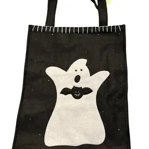 Vintage Halloween Trick or Treat Tote Bags Felt Ghost Bat Sequin Embroidery 2 pc