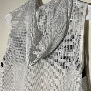 Fashion-forward sleeveless top by Bebe featuring black and white mesh paneling. Perfect for streetwear, casual styling, or layering under a jacket.
