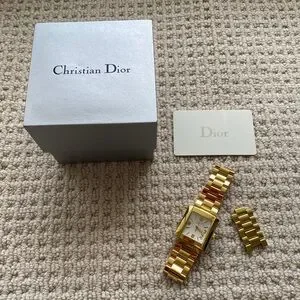 Stainless steel gold watch by Christian Dior. I’ve had this watch for three years and only wore it a handful of times, it’s an excellent condition. The gold on the watch has never tarnished. You will need to replace the battery. You will get everything pictured, including the extra links.