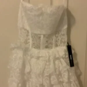 Elegant strapless lace dress. Features tiered ruffles. Perfect for special occasions.