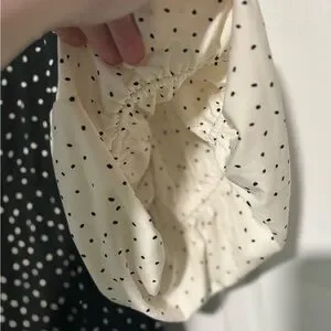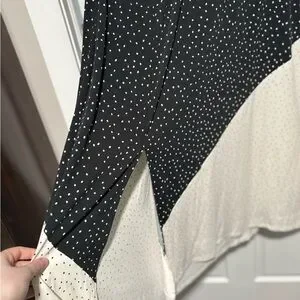 Cute asymmetrical dress with black and white polka dots. Stylish and versatile for any occasion. I work this to work a few time but it unfortunately doesn’t fit anymore. This dress looks so cute on if you are looking for a cute and unique dress. The sleeves are absolutely adorable and it has pockets!