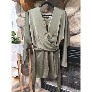 ASOS gorgeous cocktail dress || mini, sage green, silk || extra long (I have it doubled in the photos) and wide waist tie || mini length, is fitted through hips || for context I’m a 6/8 and this fits me well || deep V neckline || this dress is stunning on and excellent quality and condition