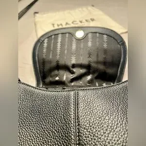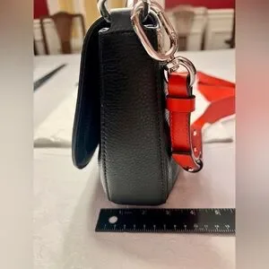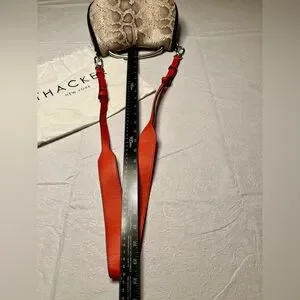 Discover the elegance of the Thacker New York shoulder bag, featuring a sophisticated snake print. The black body paired with a striking orange strap adds a touch of flair to any ensemble. Strap is removable. Dust bag included.
