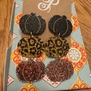 Plunder Design Trendy Fashion Jewelry Fall Triple Pumpkin 🎃 Drop Dangle Earrings Stylish earrings featuring leopard print and glittery pumpkin design. Perfect for adding a fun touch to any outfit.