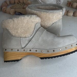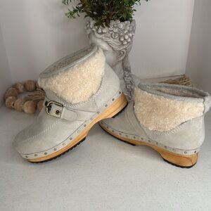 A timeless style goes cozy with these sherpa-adorned clog boots, sat on a wood platform sole and finished with fuzzy panels and buckle detailing. Low-ankle length, suede uppers, round toe, seamed details, buckle strap detail, tacked accents, platform wood sole, rubber outsole, sherpa panels and lining. Pair with printed knit socks and kick flares for a totally toasty pairing.Sz 7.5