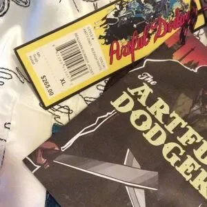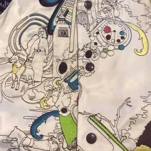 Artful Dodger Men's White Embroidered Bomber Jacket; size XL; detailed embroidery on the front, back, and sleeves; 7 front snaps for closure; front pockets; Approximate XL measurements include: