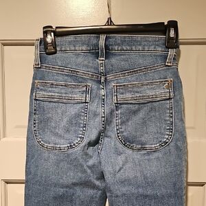 Chic flare jeans by Madewell. Light blue denim with classic styling. Perfect for versatile wear. waist 24, kick out leg, full length. magic pockets, mid rise, fitted through hip and thigh, full length